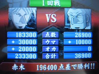 安岡の差し込みやアカギのツモ上がりとかで普通にやって一回戦トップは取れたんだけど、鷲巣のツモやノーテン罰符のせいで失血量がつもり、二回戦でアカギ→鷲巣で放銃して失血量1600ccとなって流石にこれはアカギの血がもたないと一回戦からやり直す事にしました。