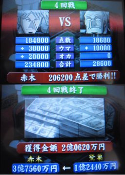 本場でがっつり点棒補充したおかげで、圧倒的点差でアカギ大勝利!