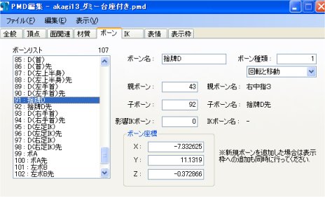 ①PMDエディタでアカギモデルに右中指3の追従ダミーボーンを仕込む。